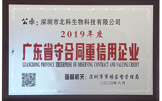 近日,廣東省市場監督管理局公布了2019年廣東省守合同重信用企業名單。北科生物憑借嚴謹創新的企業理念、誠實守信的經營原則和良好的社會信譽等方面的優異成績,被授予“2019年廣東省守合同重信用企業”的榮