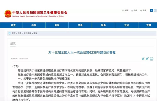 編者按:近日,國家衛生健康委員會對十三屆全國人大一次會議第6238號建議給出答復。答復稱,國家衛健委將會同藥監部門,積極推進細胞治療的相關工作。答復中還提到,“近期10余個細胞治療產品即將獲批開展臨床