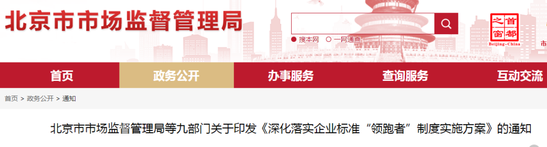 為落實《中共北京市委 北京市人民政府關于加快培育壯大新業(yè)態(tài)新模式促進北京經濟高質量發(fā)展的若干意見》,按照《市場監(jiān)管總局等八部門關于實施企業(yè)標準“領跑者”制度的意見》要求,市市場監(jiān)管局等九部門制定了《深化落實企業(yè)標準“領跑者”制度實施方案》,經市政府批準,現(xiàn)印發(fā)給你們。請認真貫徹落實,鼓勵企業(yè)創(chuàng)制先進標準,促進新業(yè)態(tài)新模式發(fā)展壯大,以高標準推動北京經濟高質量發(fā)展。