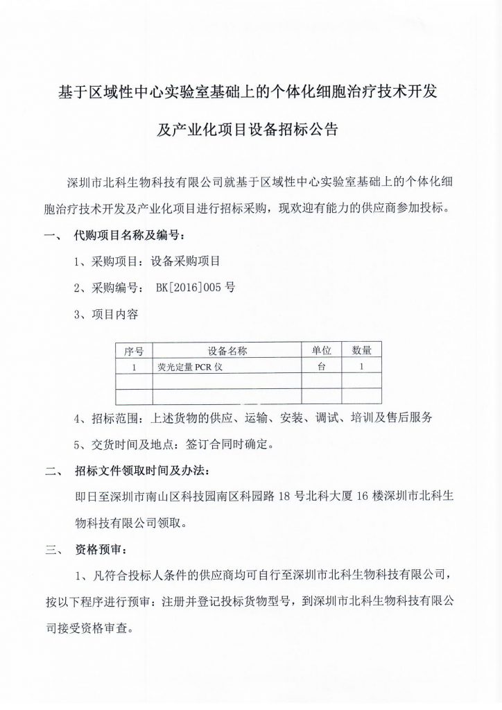 基于區域性中心實驗室基礎上的個體化細胞治療技術開發及產業化項目設備招標公告
