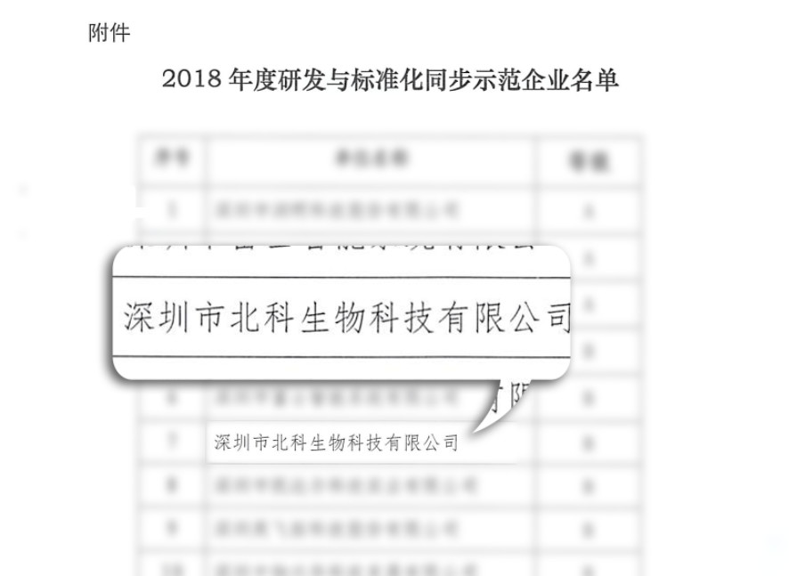 2019年02月20日,深圳市市場監督管理局發布的深市監[2019]41號文件,深圳市北科生物科技有限公司(以下簡稱:北科生物)榮獲“研發與標準化同步示范企業”稱號。